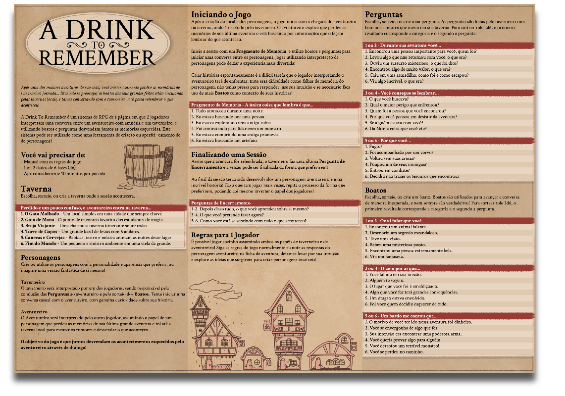 A Drink To Remember is a 1-Page RPG system for two: an amnesic adventurer and a tavern keeper. The players will create a story together using a pool of random questions and rumors.